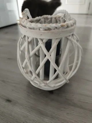 Portavelas decorativo de madera con un asa de cuerda. - Diseño tejido. - Incluye un vaso interior.