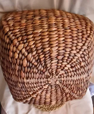Taburete de madera maciza y mimbre con un diseño natural y práctico. - Base extraíble para mayor versatilidad. - Acabado en tonos beige y marrón. En muy buenas condiciones. Presenta pequeñas señales de uso como se aprecia en las fotografias. Medidas: Alto: 45 cm, ancho 40 cm, profundidad 40 cm