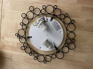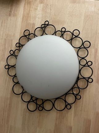 Elegante aplique de pared con un diseño circular. - Marco exterior de metal con círculos entrelazados. - Pantalla central de cristal blanco. - Ideal para dar un toque decorativo a cualquier estancia.