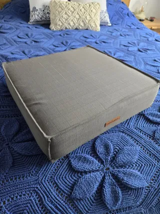 Cojín cuadrado de tela en tono gris.