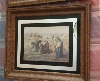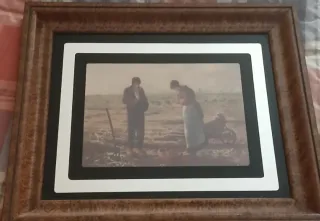 Reproducción del famoso cuadro El Ángelus de Jean-François Millet, presentado sobre espejo. Una pieza clásica para decorar. - Marco de madera con detalles. - Imagen sobre espejo. Medidas: Ancho 44 cm, Alto 37 cm.