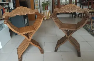 Conjunto de dos sillas antiguas de estilo Savonarola, con un diseño curvo y elegante. Perfectas para añadir un toque clásico a tu hogar. - Estructura de madera tallada. - Asiento y respaldo curvos. - Diseño cruzado en las patas. - Único desperfecto, uno de los respaldos ha sido restaurado (última foto), yo ya las compré así, quien entiende de antigüedades, sabe que no le quita valor, pero, justo por este desperfecto, las dejo por 120 euros las dos, aunque valdrían más