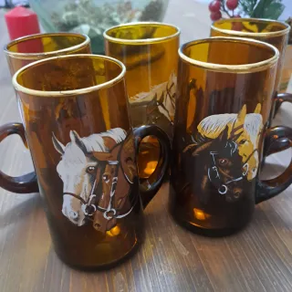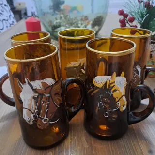 Set de jarras de cristal con un diseño de caballos. - Diseño de caballos en cada jarra. - Borde dorado. - Color ámbar.