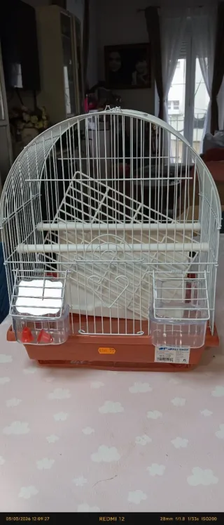 Jaula para pájaros con base y accesorios. - Estructura de alambre blanco. - Base y comederos en tono marrón. - Incluye dos comederos/bebederos.