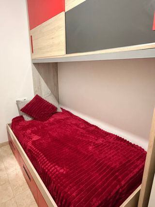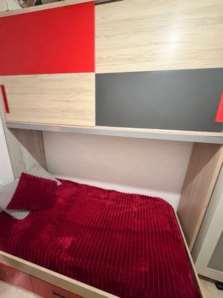 Conjunto de dormitorio que incluye cama, cajones y escritorio. - Cama individual. - Cajones integrados para almacenamiento. - Escritorio funcional.