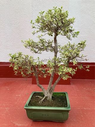 Precioso bonsái de Ligustrum variegata, ideal para coleccionistas o amantes de la jardinería. - Bonsai de 24 años. - Maceta de cerámica verde. - Tronco con raíces expuestas. - Hojas variegadas.