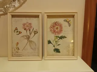Conjunto de dos cuadros decorativos con un diseño floral y mariposas. - Marco de madera en color beige. - Ilustraciones de flores y mariposas en tonos rosados y naranjas. 33'5cm. Alto 23'5cm. Ancho 2 cm. Grueso