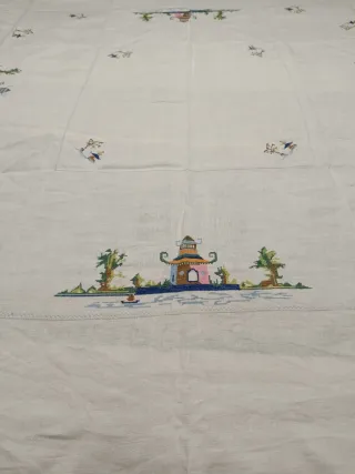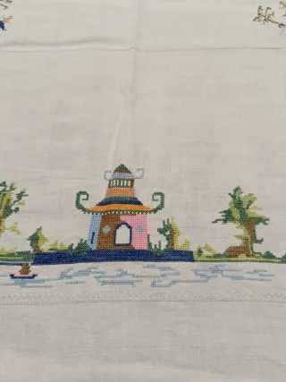 Precioso mantel artesanal con un diseño único. - Bordado detallado con motivos. - Tejido de lino de alta calidad. -Mantel bordado punto cruz con motivos chinos ( casas ) - Medidas 123 × 123