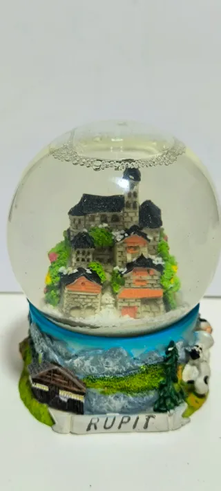 Bola de nieve con un diseño del pueblo Rupit - Representación de un pueblo con castillo. - Base decorada con paisaje montañoso y elementos como una casa de madera y ovejas. - El nombre RUPIT está grabado en la base.
