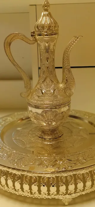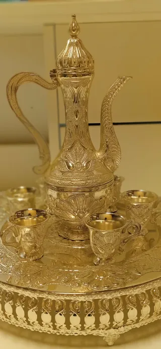 Elegante juego de té de estilo turco, con un diseño muy elaborado en metal plateado - Tetera - Juego de 6 tazas a juego. - Bandeja ornamentada.