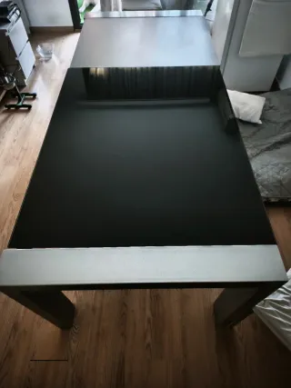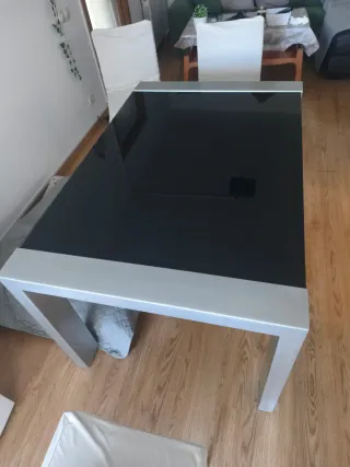 Mesa de comedor extensible con un diseño moderno y elegante y con sus 4 sillas - Superficie superior en cristal negro. - Base en acabado gris metálico. No bajo precio.
