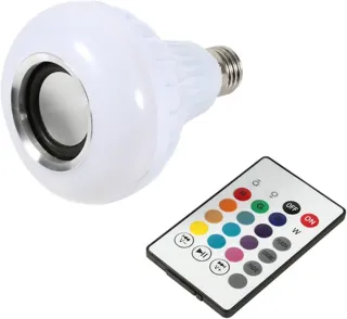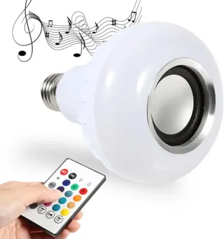 Totalmente nueva sin usar Bombilla musical Bluetooth LED E27 12W, con altavoz integrado 3W, respuesta frecuencia 135Hz-15KHz, conexión inalámbrica versión 3.0, perfil A2DP, alcance 10m Iluminación RGB multicolor regulable, reproducción audio directa desde móvil o tablet, ambiente relajante o festivo. Incluye mando remoto 24 botones para colores, modos y brillo Instalación sencilla rosca estándar, ideal vivienda, celebraciones o locales +detalles en fotos Etiquetas lámpara inteligente luz celebración hogar dormitorio salón discoteca sonora speaker wireless teléfono tableta colorida regulador domótica decoración evento noche karaoke
