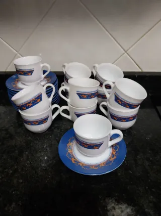 Elegante juego de café con un diseño distintivo. - Taza y platillo de 12 servicios. Modelo de Arcopal France, de vidrio opalino. - Decoración con motivos florales en azul y detalles dorados. - Borde de la taza con un patrón ornamental. Utilizado en contadas ocasiones.