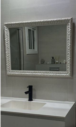 Elegante espejo de lavabo con un marco detallado que añade un toque de estilo a tu baño. - Marco con diseño ornamental. - Acabado en color blanco.