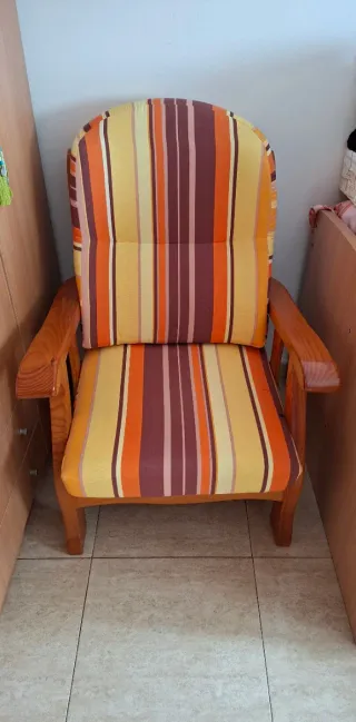 Butaca de madera de pino con un diseño de rayas vibrantes. - Estructura de madera de pino. - Tapicería con rayas en tonos naranja y amarillo.
