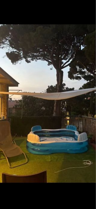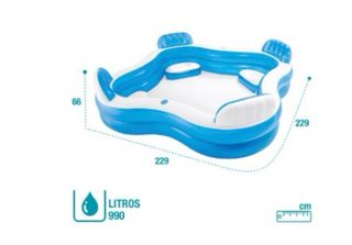 Piscina hinchable con asientos incorporados para mayor comodidad. - Diseño moderno en tonos azules y blancos. - Fabricada en plástico resistente.