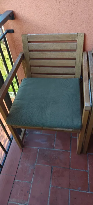 Silla de exterior con reposabrazos muy cómoda. Perfecta para disfrutar de tu espacio al aire libre. - Estructura de madera robusta. - Cojín blanco incluido para mayor comodidad. Se tienen que arreglar, lijar un poco y dar una mano de barniz. El precio de compra fueron 322€.