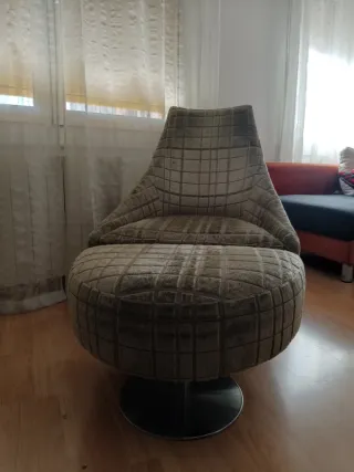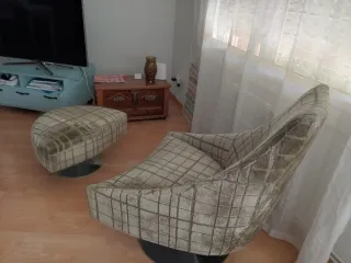 Conjunto de sillón y puf con un diseño moderno y cómodo. - Tapicería con estampado a cuadros. - Base giratoria en ambos elementos. Disponibilidad de dos unidades por 190Euros, los dos sillones con sus pufs