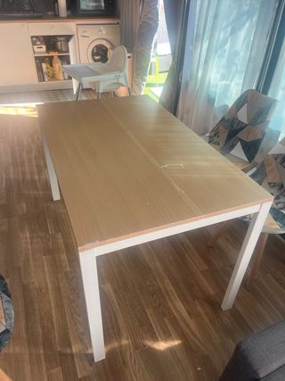 Mesa de comedor con un diseño moderno y funcional. - Tablero vinilado en madera con acabado natural. - Patas de metal blanco. El vinilo tiene un arañazo pero puede ser cambiado sin problema. RECOGIDA EN BWRGA