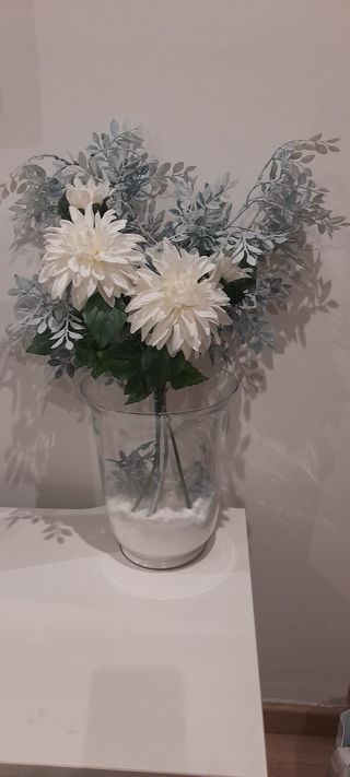 Elegante jarrón de cristal transparente con un bonito ramo de flores artificiales blancas y follaje verde. - Base de cristal con relleno de piedras blancas. - Flores artificiales de alta calidad.