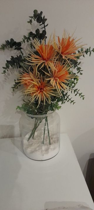 Elegante jarrón de cristal transparente con un bonito ramo de flores artificiales en tonos naranja y amarillo. La base del jarrón está decorada con material blanco. - Flores artificiales de aspecto realista. - Jarrón de cristal de gran tamaño.