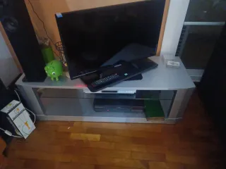Mueble de televisión con un diseño moderno y funcional. - Estructura de metal y cristal. - Combinación de colores plata y negro.