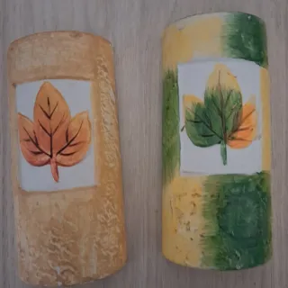 Conjunto de dos velas decorativas con diseño de hojas de otoño. - Una vela en tonos beige y ocre. - La otra vela combina amarillo y verde. - Cada vela presenta un panel decorativo con hojas pintadas.