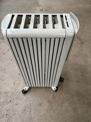 Estufa eléctrica de aceite OMAS modelo 2ARO 1506. Ideal para calentar espacios de forma eficiente. - Diseño vertical con ruedas para fácil movilidad. - Panel de control para ajustar la temperatura. - Indicador luminoso de funcionamiento.