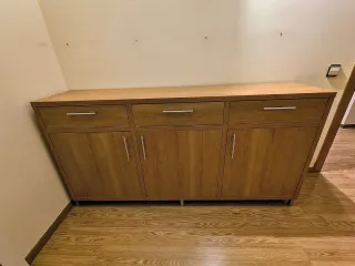 Recogida en la Molina. Mueble aparador de gran tamaño con acabado en color cerezo 180x91x43 . Cuenta con tres cajones en la parte superior y tres puertas en la parte inferior con estante. RECOGIDA EN LA MOLINA - Diseño moderno y funcional. - Tiradores metálicos. - Patas metálicas discretas.