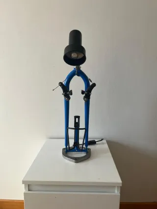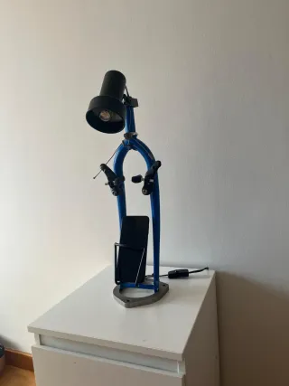 Original lámpara de diseño industrial, creada a partir de piezas de metal reciclado. - Base metálica con forma de escudo. - Estructura principal en color azul. - Incorpora frenos de bicicleta. - Bombilla LED incluida.