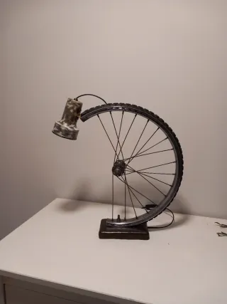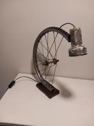 Original lámpara de mesa con un diseño industrial único, combinando elementos metálicos y de madera. - Base de madera robusta. - Rueda de bicicleta como estructura principal. - Portalámparas metálico con acabado envejecido.