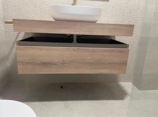 Mueble de baño suspendido compuesto por dos piezas de la marca Royo, con un diseño moderno y funcional de 1m de ancho. Precio original 400€. - Acabado en madera clara. - Detalles en metal. - Diseño suspendido. ES SOLO EL MUEBLE, NO INCLUYE TOALLERO LATERAL, NI LAVABO NI GRIFO. No se ha usado.