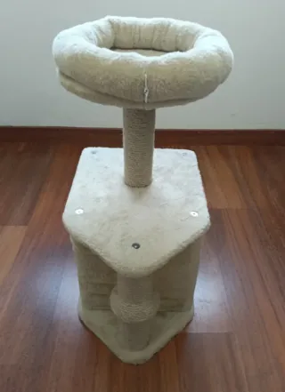 Rascador para gatos con varios niveles y zonas de descanso. - Base estable y segura. - Túnel para jugar y esconderse. - Cama superior mullida para dormir.