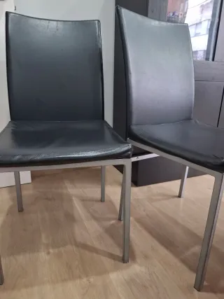 Conjunto de cuatro sillas de comedor. - Patas metálicas plateadas. - Asiento y respaldo tapizados en polipiel negra.
