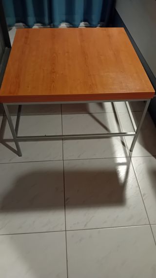 Mesa de centro de madera y metal en color marrón y plateado. Es una mesa pequeña y práctica, ideal para espacios reducidos. - Medidas aproximadas: 40cm x 40cm x 70cm - Estructura sencilla y elegante.