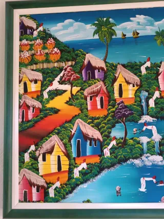 Cuadro original de vibrantes colores, pintado a mano. Comprado a un pintor en la República Dominicana en el año 1995. En todos éstos años, no ha perdido ni un poco de color. Es de estilo auténtico Naif. En el cuadro se indica la firma del pintor "Moreno". Está súper bien conservado, e incluye el marco de madera. Se entrega tal y cómo se ve en la fotos. Se puede enviar y si se reside por algún lugar de la provincia de Girona, (depende de cuál), se puede entregar en mano.