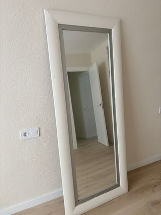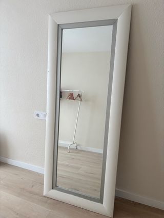 Espejo de cuerpo entero con un marco moderno. - Marco de plástico en color blanco y gris. - Cristal de espejo. - Presenta un pequeño desperfecto en un lateral.