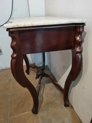 Elegante consola de estilo clásico con tablero de mármol y estructura de madera. - Diseño curvo y ornamentado. - Patas talladas con detalle. - Soporte central decorativo. Medidas Largo: 105 cm Fondo máximo: 50 cm Altura: 92 cm No se hacen envíos. Pago por bizum o transferencia.