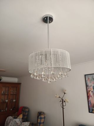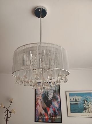 Preciosa lámpara colgante de estilo moderno. Ideal para dar un toque elegante a cualquier espacio. Características del producto: - Diseño con cristales transparentes que aportan luminosidad. - Estructura metálica plateada de gran calidad. - Perfecta para salones o comedores. - Desmontada y embalada en perfectas condiciones. Cualquier duda preguntar :)