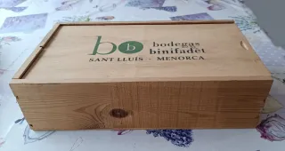Caja de madera para 2 botellas de vino Bodegas Binifadet Menorca. Tapa corredera y asa de cuerda, todo en perfectas condiciones, ideal para regalar vino. Medidas h.37,5 cm x a.20,5 x p.10,5 cm