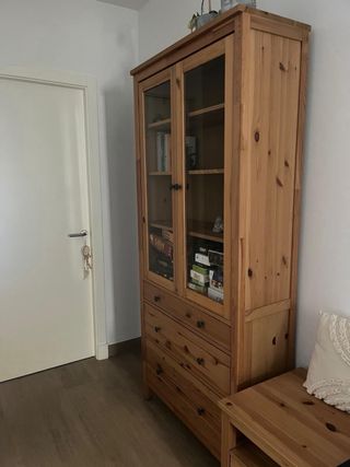 Vitrina con cajones modelo Hemnes de Ikea. Un mueble de almacenaje versátil y elegante. medidas: 90 ancho, 197 alto y 37 de fondo. - Diseño de madera con acabado en tono marrón. - Incorpora varios cajones para guardar objetos. - Parte superior con puertas de cristal para exhibir elementos