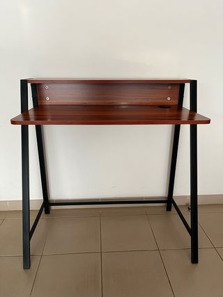Escritorio con un diseño moderno y funcional. - Acabado en madera de color marrón. - Estructura de metal en color negro. - Incluye un práctico hueco para pasar cables.