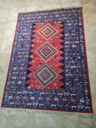 Alfombra de lana virgen con un diseño geométrico llamativo en tonos rojos y azules. Sus dimensiones son 140x200 cm. - Elaborada con lana de alta calidad. - Patrón central de rombos. - Bordes decorados con motivos tradicionales.