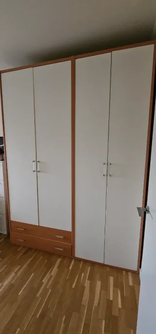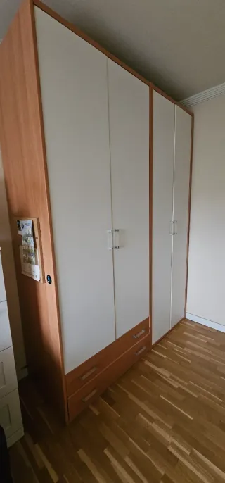 Se venden dos armarios de dormitorio con un diseño moderno y funcional. Ideales para organizar tu ropa y pertenencias. - Combinación de madera clara y frentes blancos. - Tiradores metálicos. - Cajones inferiores para almacenamiento adicional. 1 armario mide 100x60x240 1 armario mide 80x35x240