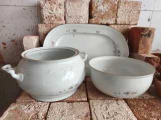 Elegante conjunto de vajilla vintage con un delicado diseño floral. Medidas sopera:17 centímetros de boca x 12 centímetros de alto Medidas bandeja:39 centímetros de largo x 24 centímetros de ancho Medidas ensaladera:20 centímetros de diámetro x 10 centímetros de alto - Pieza central ovalada con borde festoneado. - Fuente redonda con asas. - Cuenco hondo.