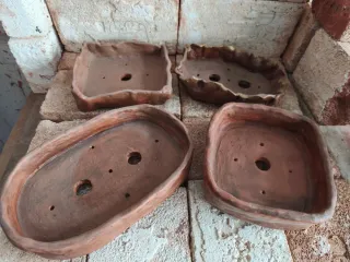 Conjunto de cuatro macetas de terracota, ideales para bonsái. Medidas:14 centímetros de largo x 13 centímetros de ancho x 3 centímetros de alto x 2 centímetros de profundidad . Medidas:15 centímetros de largo x 14 centímetros de ancho x 5 centímetros de alto x 3 centímetros de profundidad Medidas:18 centímetros de largo x 12 centímetros de ancho x 4 centímetros de alto x 3 centímetros de profundidad Medidas:21 centímetros de largo x 13 centímetros de ancho x 4 centímetros de alto x 2 centímetros de profundidad - Diseño variado. - Tonos naturales en beige y marrón.