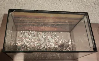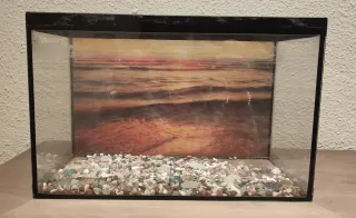 Pequeña pecera de cristal con un fondo decorado y piedras.