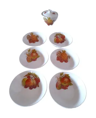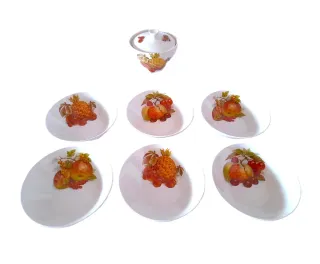 Juego de Macedonia , Ensalada , Aperitivos - Marca Pontesa , Chinamoda . 6 Cuencos + Azucarero . Vintage . Porcelana . Medidas aprox en foto . Más modelos en otros enlaces