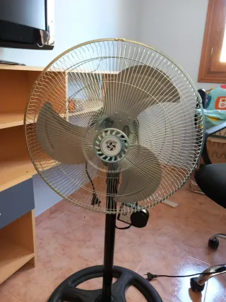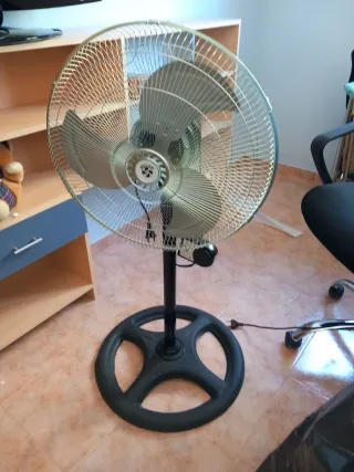 Ventilador de pie con base redonda y rejilla protectora. - Altura ajustable. - Rejilla de metal. - Base de plástico resistente.