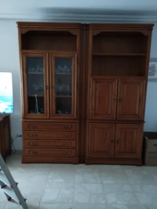 Conjunto de muebles de salón de madera con detalles de cristal. - Mueble vitrina con puertas de cristal y cajones. - Mueble auxiliar con puertas de madera. - Diseño clásico y elegante.
